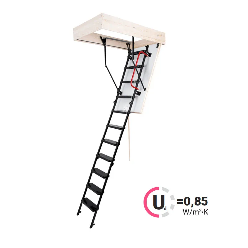 Складная 3-х секционная чердачная лестница. Рабочая поверхность полностью выполнена из алюминия. Термоизоляционная крышка типа "сэндвич" имеет усиленную теплозащиту, облицована с двух сторон ДВП белого цвета. По контуру короба имеется уплотнитель; Все металлические элементы лестницы покрыты порошковой краской.