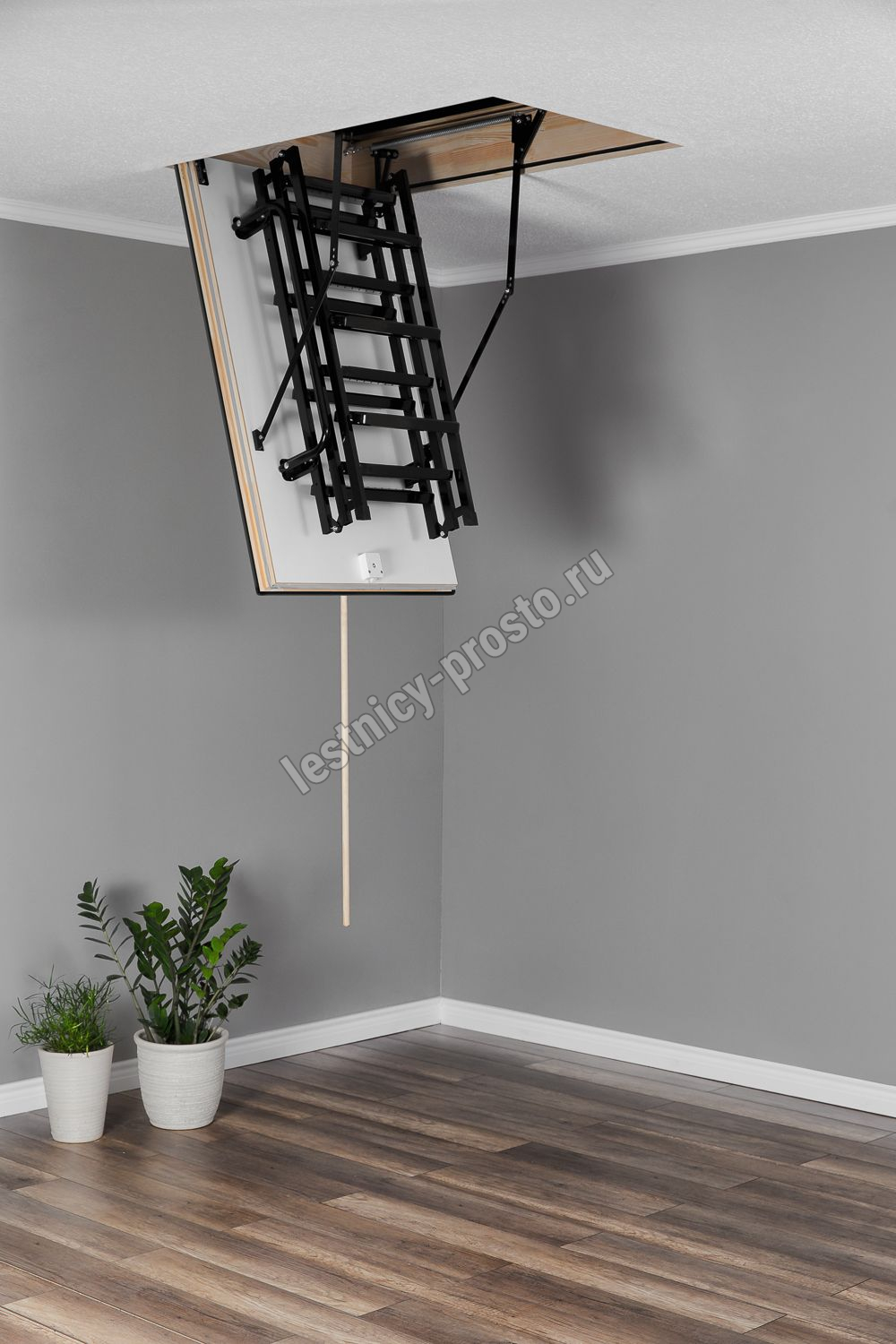 Противопожарная лестница, огнестойкость EI 60 Лестница чердачная складная металлическая 3-х секционная. Ступени полностью выполнены из металла и покрашена порошковой краской. Термоизоляционная крышка типа “сэндвич “, толщиной 66мм, утеплена пенопластом , облицована с двух сторон ДВП белого цвета. Короб деревянный высотой 170мм. Лестница имеет 3 уплотнителя, один проходит по периметру короба, и два по периметру крышки люка, в том числе и противопожарный.