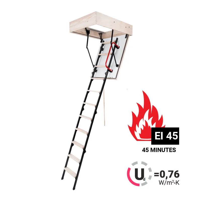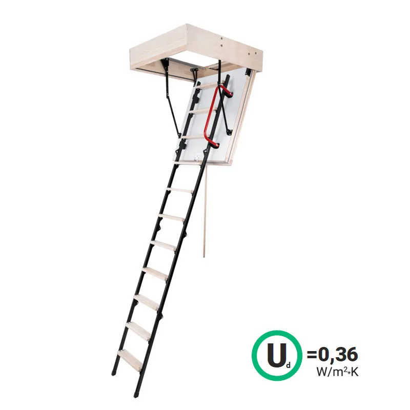 Складная 3-х секционная чердачная лестница. Рабочая поверхность полностью выполнена из алюминия. Термоизоляционная крышка типа "сэндвич" имеет усиленную теплозащиту, облицована с двух сторон ДВП белого цвета. По контуру короба имеется уплотнитель; Все металлические элементы лестницы покрыты порошковой краской.