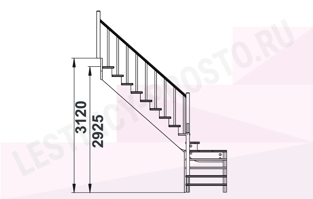 Ступени и поручень лестницы выполнены из бука, остальные элементы из сосны. Возможно изготовление данной модели полностью из бука. Базовый комплект включает в себя деревянные элементы лестницы и ограждения без какого-либо покрытия.