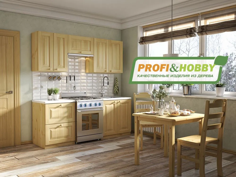 Небольшой кухонный гарнитур из 100% массива сосны шириной всего 2 и высотой 2,32 метра (верхние шкафы 90 см). Один из самых распространенных проектов кухни, который подойдёт для небольшой квартиры, загородного дома, гостиницы или хостела.