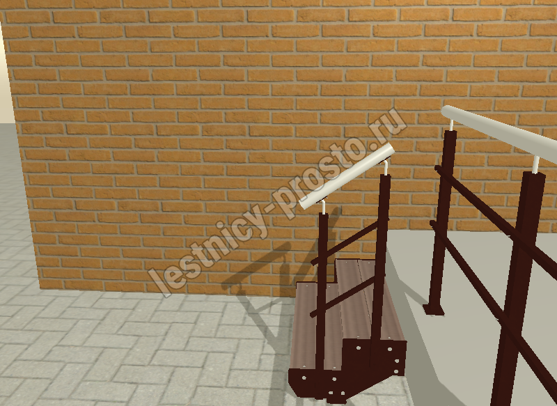 Ступени лестницы состоят из металлической рамки, обеспечивающей необходимую прочность, и покрытия из террасной доски ДПК (древесно-полимерный композит). Ступени не боятся воды и мороза, не теряют со временем свой внешний вид и не требуют ухода.