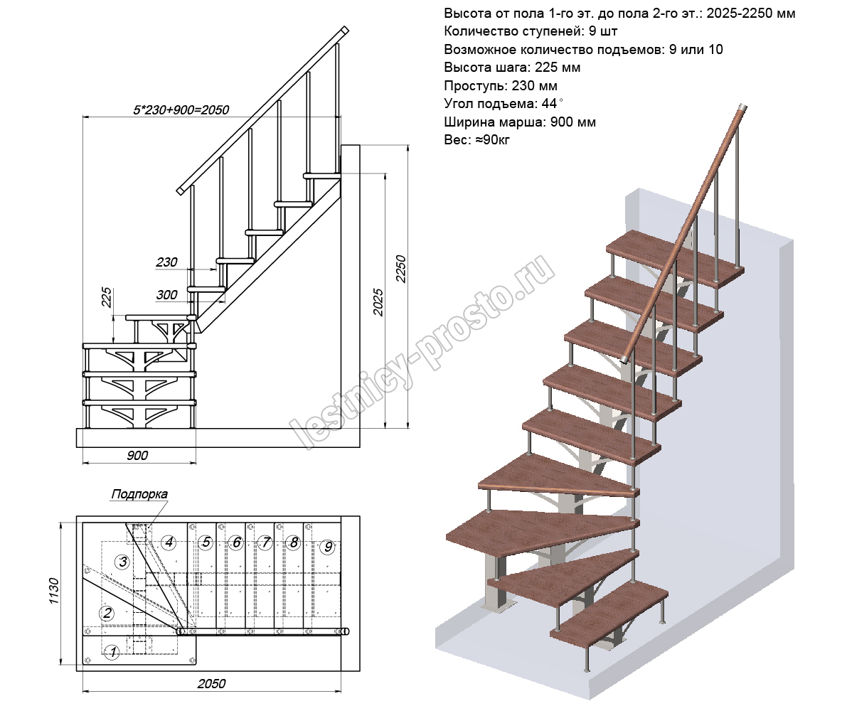 Лестница PROSTO MONO Г-образная h225 см, ступени хвоя