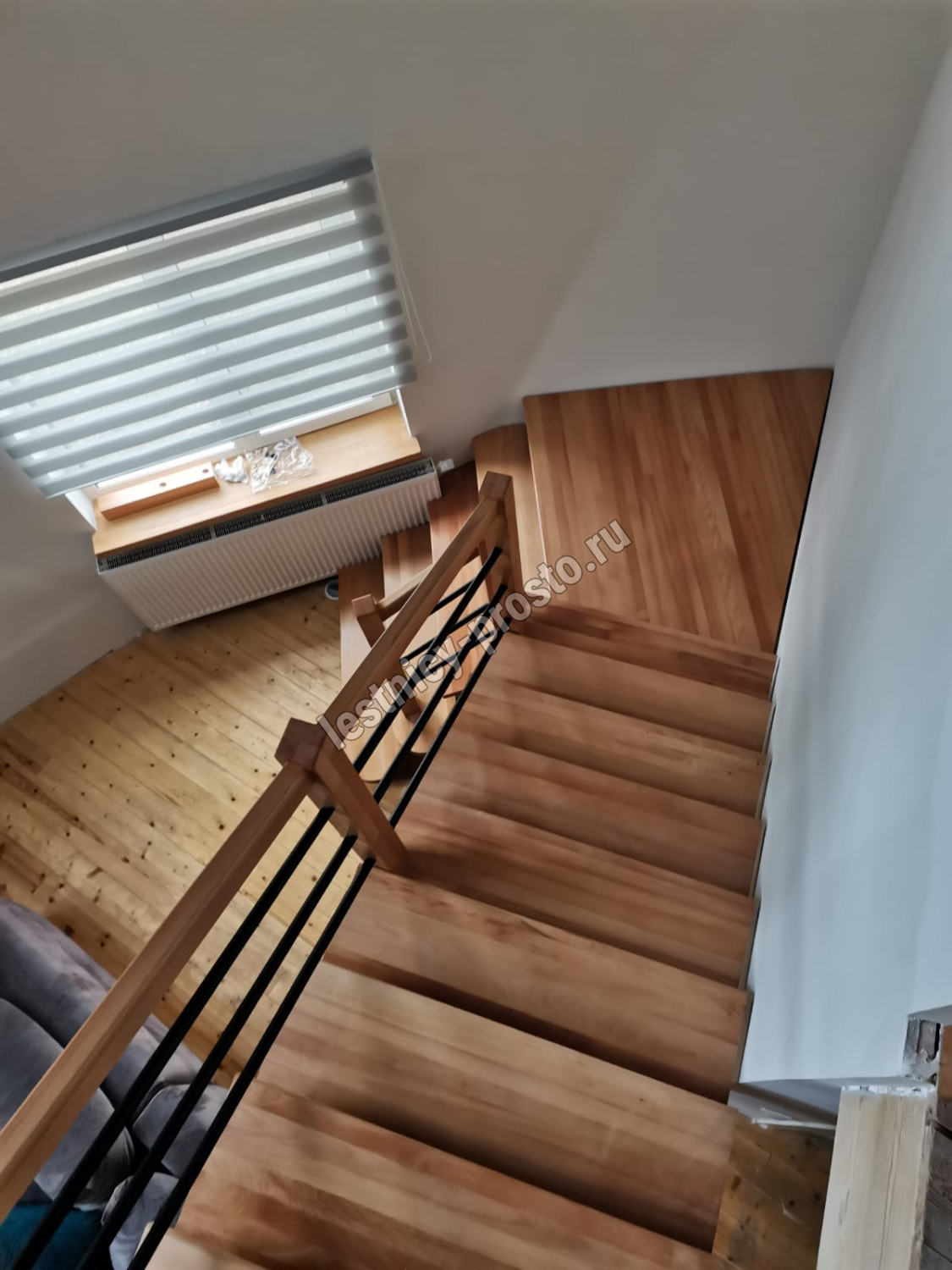 Поворот на 90° реализован посредством площадки, высота поворота определяется параметрами вашего помещения и размерами проёма.