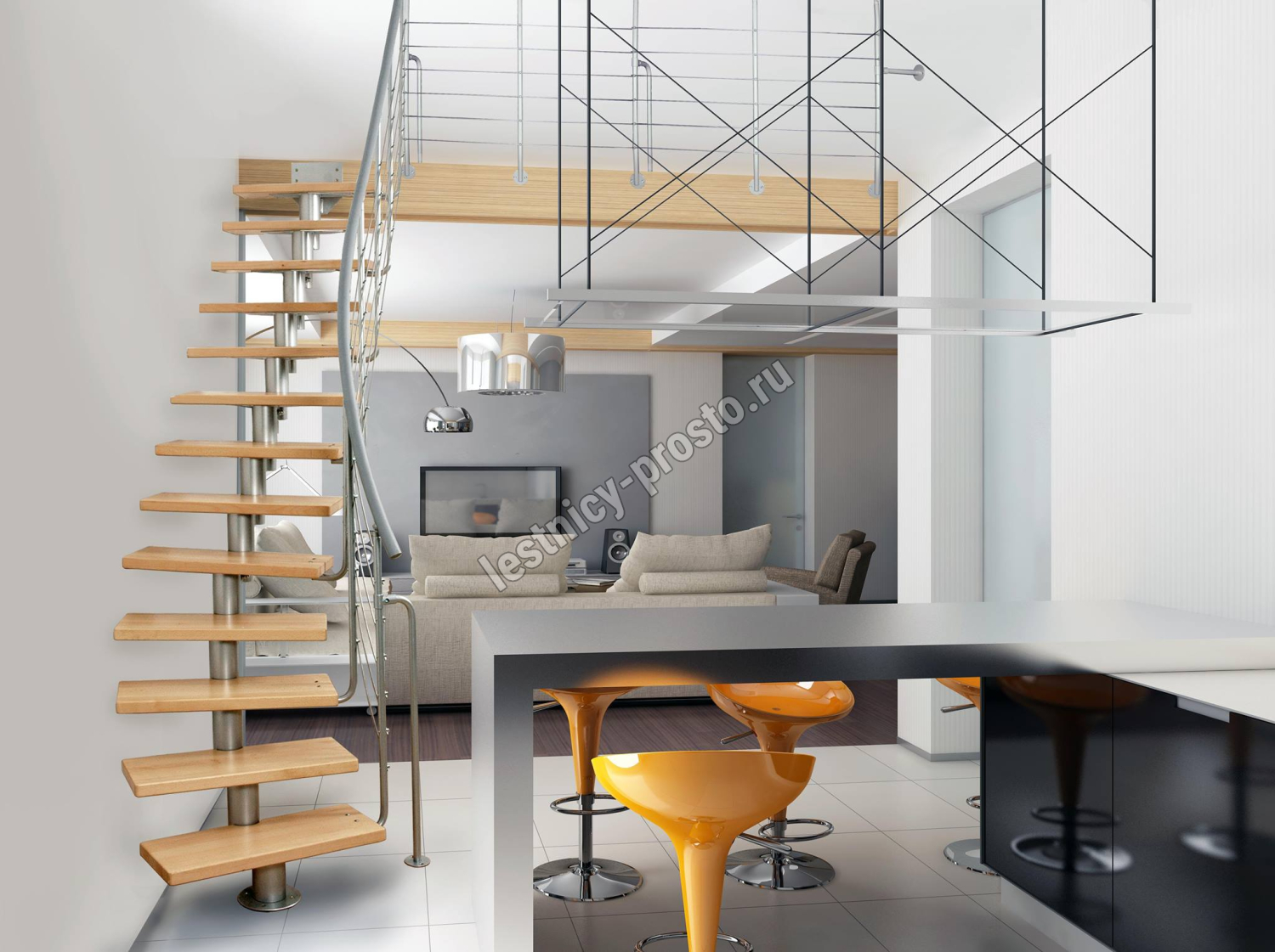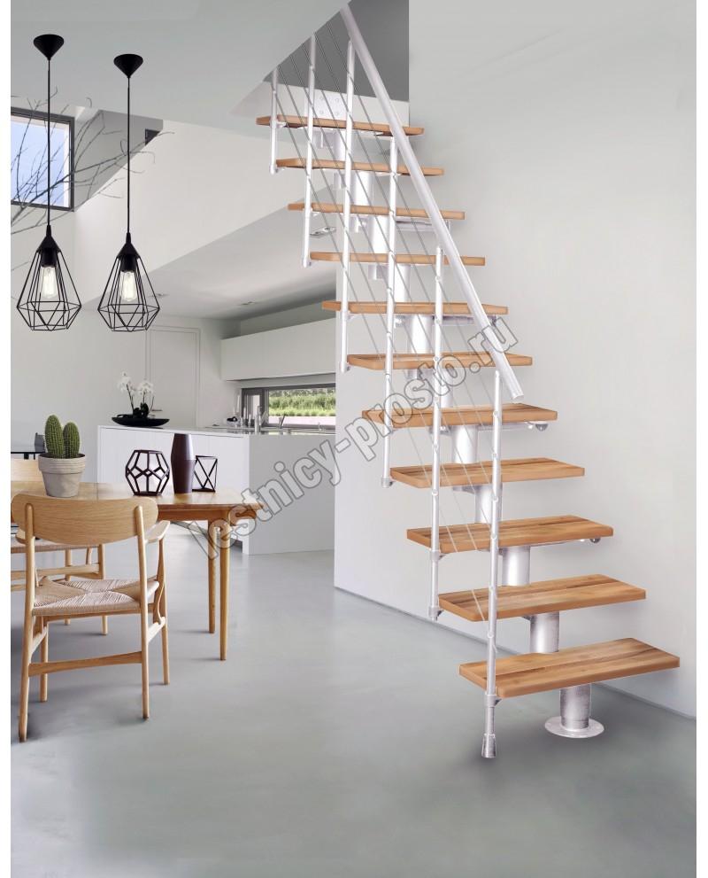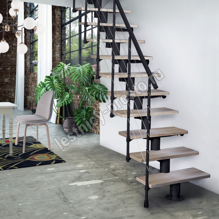 Лестница на стальном модульном каркасе. Высота лестницы регулируется при сборке засчет регулировки высоты шага. Ступени покрыты защитным лаком. Ограждение из стали с пластиковым поручнем. В комплект входят перила с вертикальными стойками и горизонтальными перегородками. Изделие поставляется с шурупами (кроме потолочных и напольных анкеров), инструкциями по монтажу и эксплуатации и гарантией. Внимание! Для этой лестницы необходимо крепление к стене.