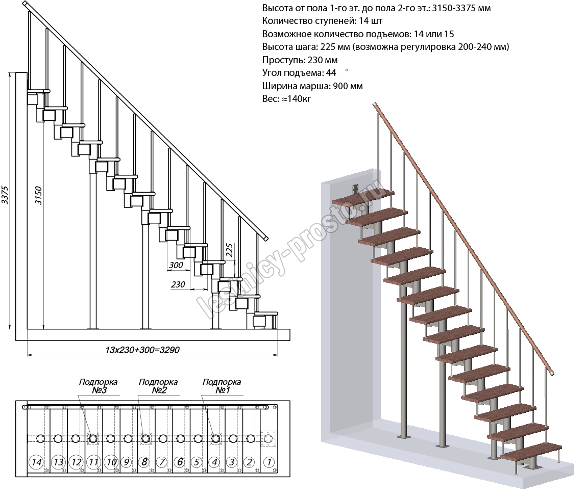 Высота лестницы 3150 - 3375 (14 ступеней) мм