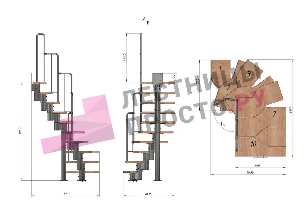 Лестница Prosto Urban White гусиный шаг 700 мм, h180-264 см (10 ступеней), дуб