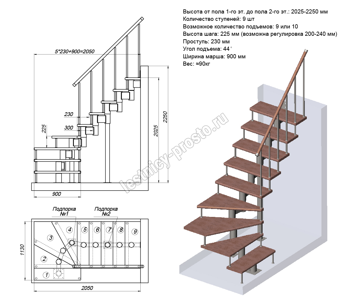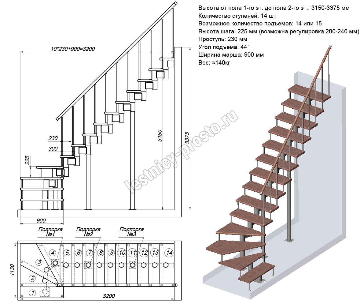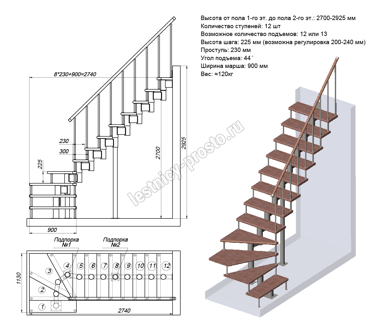 Количество ступеней до поворота - может быть любым , по запросу мы рассчитаем стоимость и сделаем чертеж-схему в соответствии с вашими параметрами.