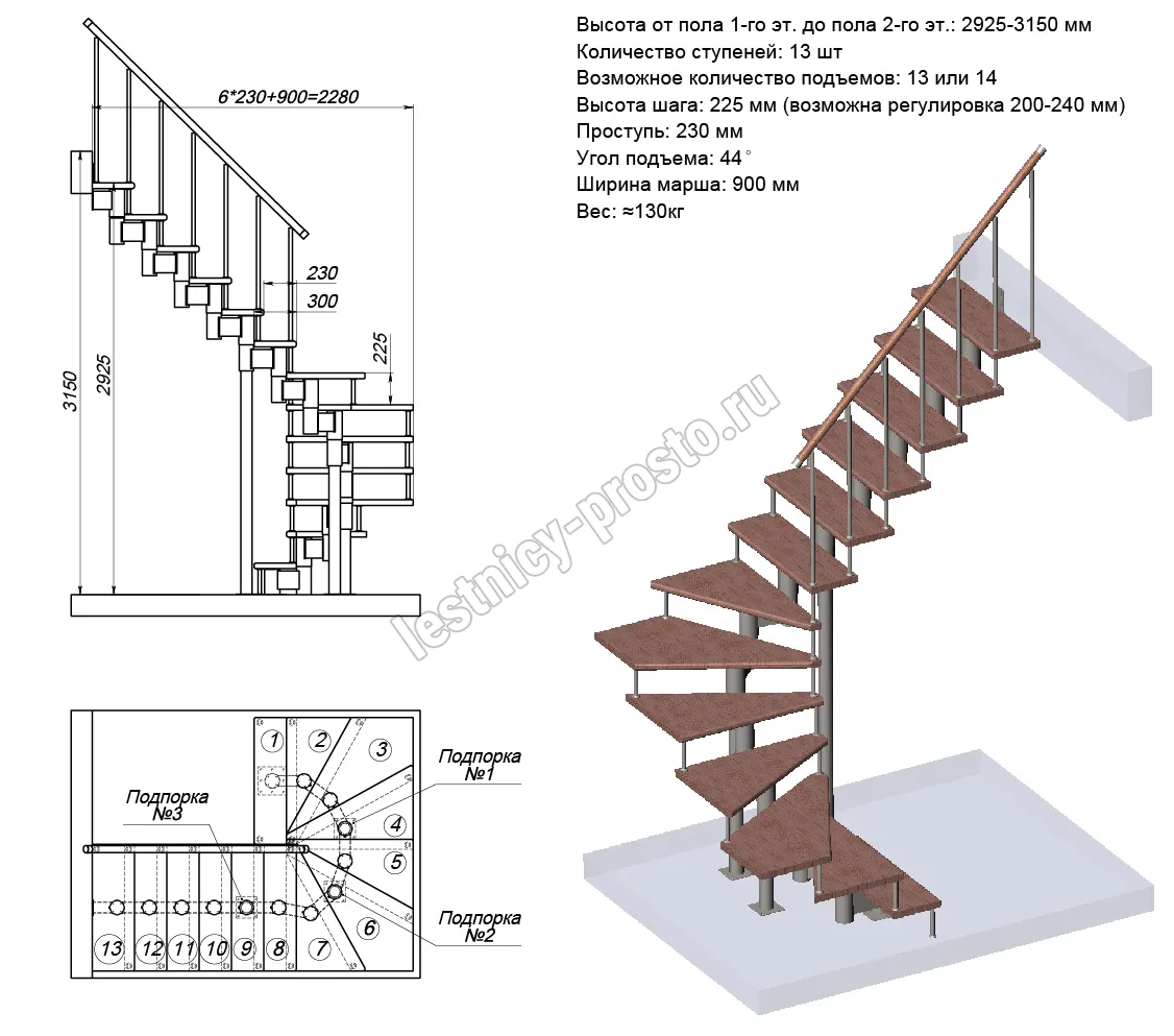 Схема и расчет указаны для шага 225 мм - мы рекомендуем эту высоту шага, как оптимальную для обеспечения комфортного подъёма и экономии бюджета.