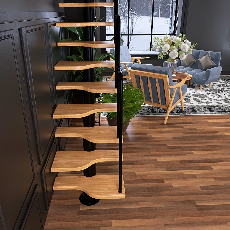 ATRIUM DIXI PLUS - это современная и удобная лестница, занимающая сравнительно мало места. В набор входят 11 конструктивных элементов и 11 ступеней из массивного лакированного дерева (8 прямых ступеней и 3 забежные ступени).