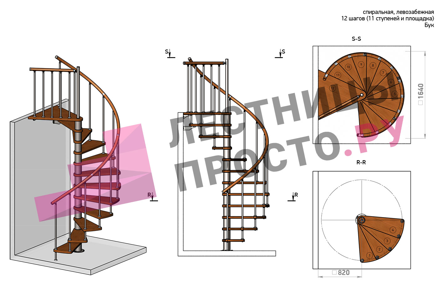 Винтовая лестница Prosto Spiral Black D160см, h260.5-304.6 см, бук