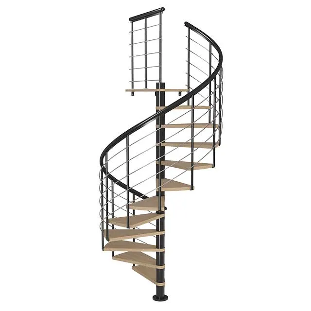 Ступени лестницы изготовлены из бука по технологии MULTIPLEX и покрыты износостойким защитным лаком. Лестница монтируется как по часовой стрелке, так и против. Возможен монтаж в круглый или квадратный проём. Ограждение: стальные трубки, Ø25 мм RAL 7016. Поручень: гибкий цельный ПВХ-поручень Ø40 мм антрацитового цвета. Конструкция и балюстрада окрашены порошковым способом в антрацитовый цвет (RAL 7016).