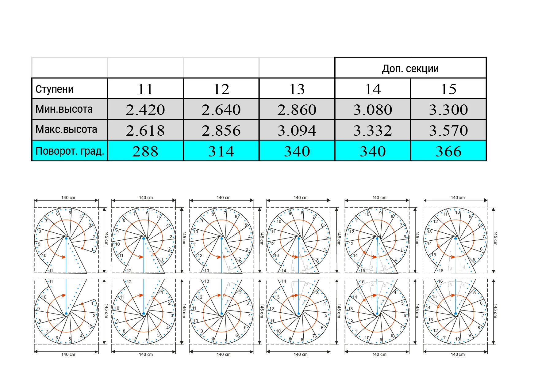 Варианты высоты лестницы с разным количеством ступеней